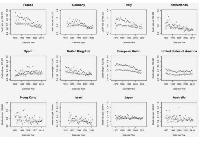 1970 年至 2012 年,在不同國家和地區(qū),男性甲狀腺癌死亡率穩(wěn)定下降,圖片來源:參考文獻(xiàn)[4]