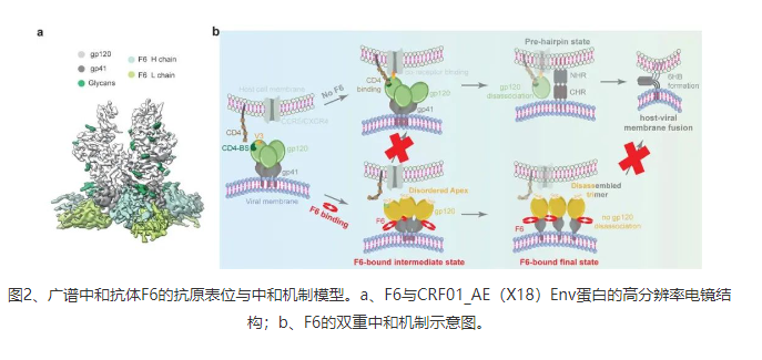 F6是第一株分離自CRF01_AE感染個(gè)體的廣譜中和抗體。研究團(tuán)隊(duì)還通過(guò)高分辨率冷凍電鏡結(jié)構(gòu)解析揭示了F6在Env蛋白上的詳細(xì)抗原表位(圖2a),并進(jìn)一步通過(guò)結(jié)構(gòu)分析與功能實(shí)驗(yàn)驗(yàn)證闡明了F6的新型中和機(jī)制(圖2b):F6一方面通過(guò)變構(gòu)效應(yīng)擾動(dòng)Env蛋白三聚體Apex區(qū)域的穩(wěn)定性,破壞Env蛋白與宿主CD4受體的結(jié)合,另一方面通過(guò)誘導(dǎo)三聚體的解體來(lái)阻礙Env蛋白介導(dǎo)的病毒包膜與細(xì)胞膜的融合,進(jìn)而抑制病毒對(duì)于宿主的入侵(圖2b)。