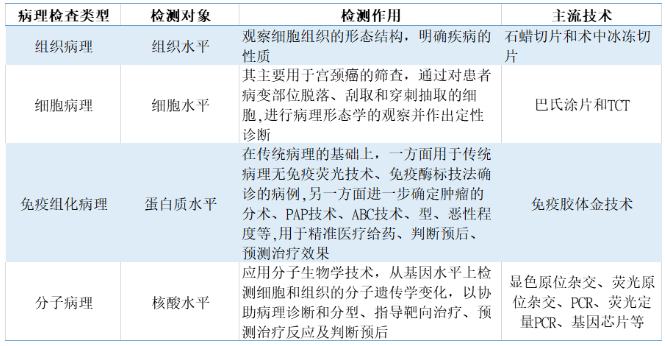 病理學(xué)根據(jù)發(fā)展階段的不同主要分為傳統(tǒng)病理技術(shù)(組織病理、細(xì)胞病理)、免疫組化病理和分子病理。傳統(tǒng)的組織病理建立在組織、細(xì)胞的水平上,可以通過病理醫(yī)師的顯微鏡診斷來判斷疾病的性質(zhì)(炎癥性病變還是腫瘤型病變、良性腫瘤還是惡性腫瘤等);免疫組化病理建立在蛋白質(zhì)水平上,可以進(jìn)一步判斷腫瘤的組織來源、原發(fā)部位、病理分型、殘留邊緣癌細(xì)胞等,除了診斷作用以外還具有指導(dǎo)預(yù)后的作用;分子病理建立在核酸分子水平上,可以確定腫瘤的基因突變類型,用于后續(xù)靶向藥物的指導(dǎo)以實(shí)現(xiàn)精準(zhǔn)醫(yī)療。