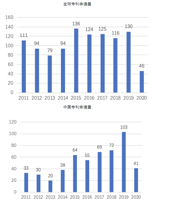 上圖所示為以“病理診斷”和“細(xì)胞病理”進(jìn)行全球檢索得到的近10年的專利申請情況。從圖中可以看出,病理診斷領(lǐng)域近10年約有1055件專利申請(由于發(fā)明專利有18個月公開的滯后期,實(shí)用新型從申請到公開也需一段時(shí)間,因此2019年和2020年數(shù)據(jù)有所偏差),其中發(fā)明專利604件、實(shí)用新型專利179件。從圖2中可以看出,全中國病理診斷領(lǐng)域近10年約有525件專利申請(由于發(fā)明專利有18個月公開的滯后期,實(shí)用新型從申請到公開也需一段時(shí)間,因此2019年和2020年數(shù)據(jù)有所偏差)。