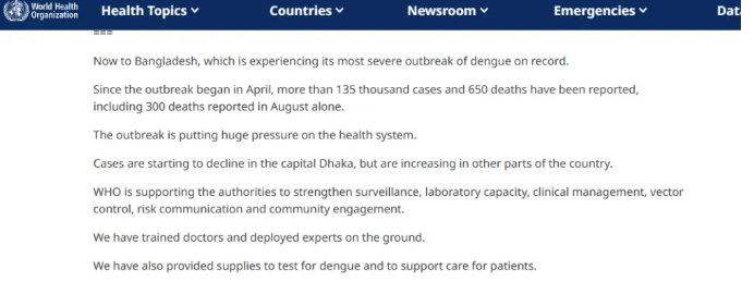 世衛(wèi)組織(WHO)周三表示,孟加拉國正在經(jīng)歷有記錄以來最嚴重的登革熱疫情,自4月份疫情爆發(fā)以來,該國報告了超過13.5萬例登革熱病例,已有650多人死亡。
