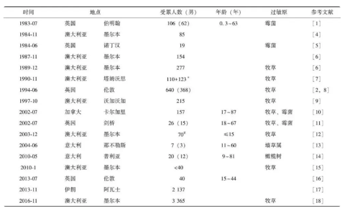 此后,陸續(xù)在全球范圍內(nèi)均有雷暴哮喘事件的相關(guān)報(bào)道,主要發(fā)生在英國(guó)、澳大利亞,另外加拿大、意大利、伊朗等國(guó)家也有類似報(bào)道。(下方表格中總結(jié)了自1983年以來文獻(xiàn)報(bào)道過的雷暴哮喘事件)